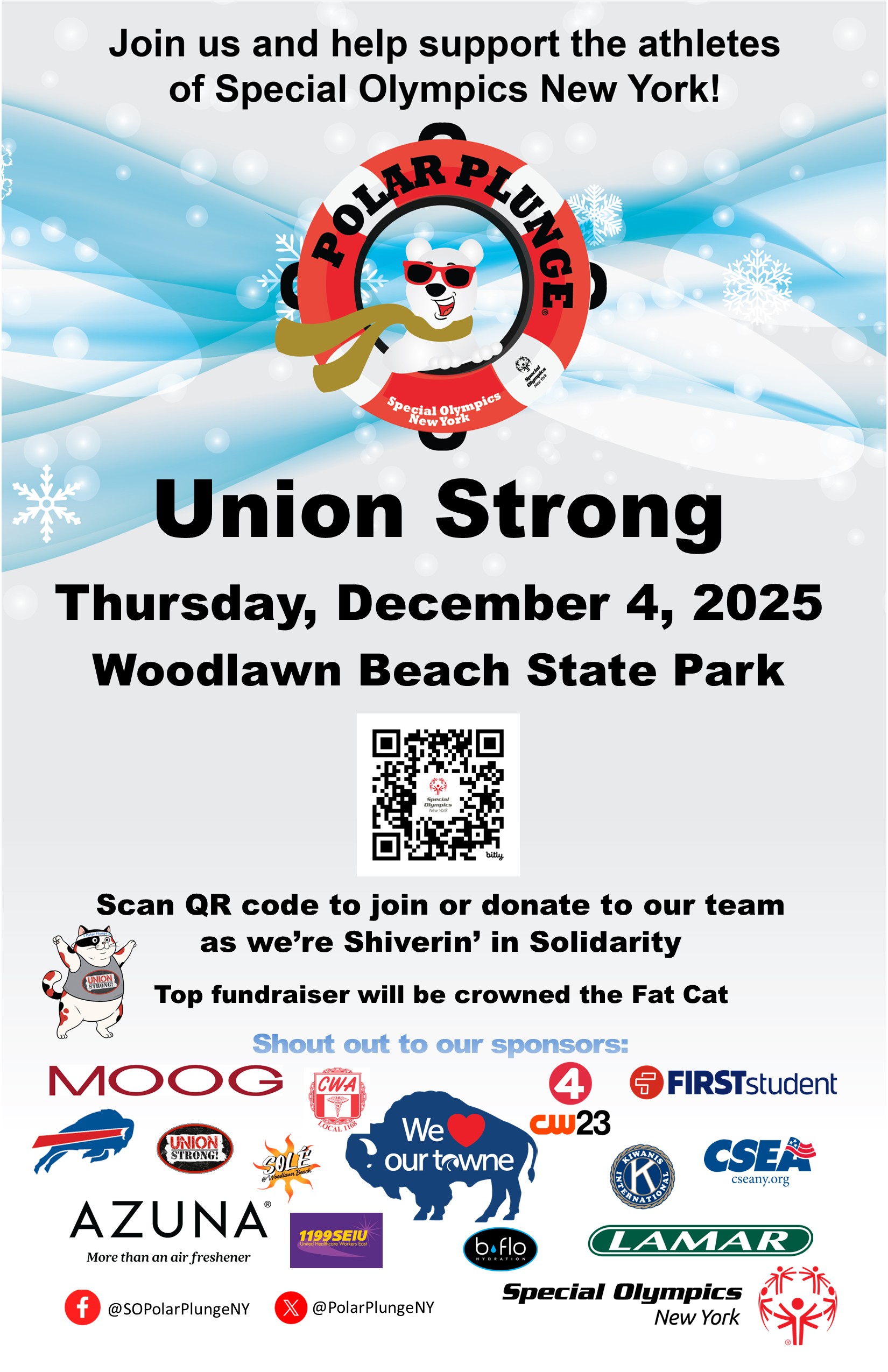 Our local is proud to once again take the plunge for a great cause — supporting the athletes of Special Olympics New York at this year’s Union Strong Polar Plunge on Thursday, December 4, 2025, at Woodlawn Beach State Park.