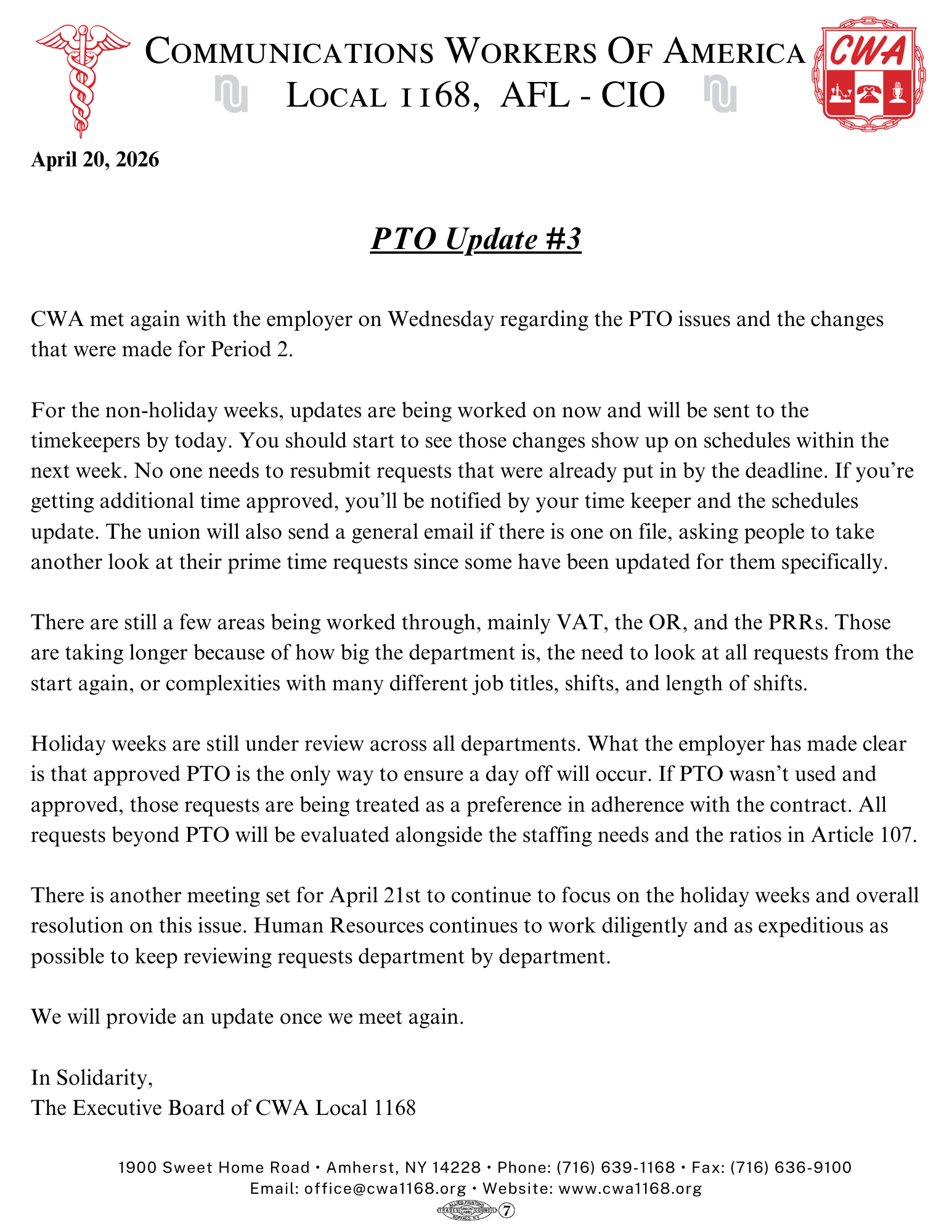 CWA met again with the employer to address ongoing PTO issues. Updates for non-holiday weeks are being processed now, with more work continuing on holiday schedules—we’ll keep members informed as progress continues